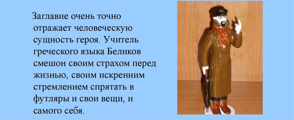 Беликов – учитель греческого языка. Он не выходил из дома, не надев калоши, высоко не подняв воротник и не раскрыв зонт, вне зависимости от погодных условий. Большинство предметов, которые использовал учитель, были в чехлах: зонт, часы, нож… Он следовал запретам, создавал их сам, однако боялся малейших перемен, осуждал все отклонения в поведении. Комфортное состояние для Беликова – жизнь, огражденная от всех футляром. Однако Беликов не был обычным человеком с причудами, он был злым и агрессивным. Имени и отчества Беликова ни упоминается ни разу на протяжении всего рассказа, что свидетельствует об отстраненном отношении рассказчика к нему: для кажлого Беликов был чужим.