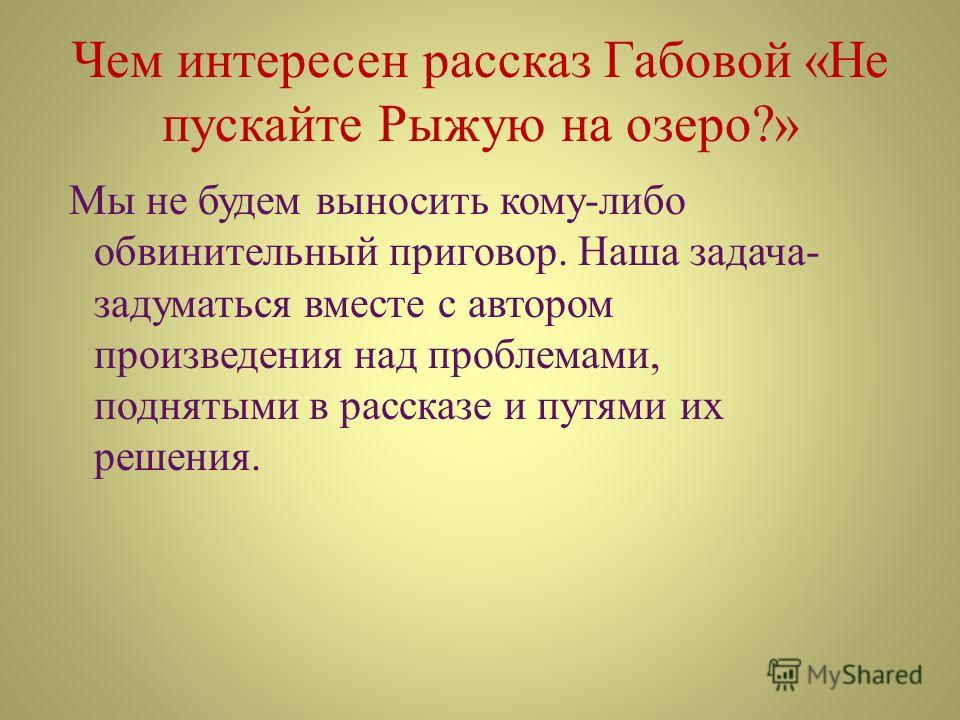 Чем интересен рассказ Габовой «Не пускайте Рыжую на озеро?» Мы не будем выносить кому-либо обвинительный приговор. Наша задача- задуматься вместе с автором произведения над проблемами, поднятыми в рассказе и путями их решения.