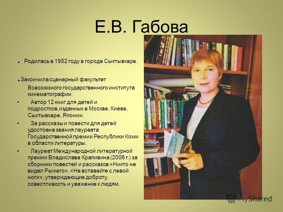 Е.В. Габова. Родилась в 1952 году в городе Сыктывкаре.. Закончила сценарный факультет Всесоюзного государственного института кинематографии. Автор 12 книг для детей и подростков,изданных в Москве, Киеве, Сыктывкаре, Японии. За рассказы и повести для детей удостоена звания лауреата Государственной премии Республики Коми в области литературы. Лауреат Международной литературной премии Владислава Крапивина (2006 г.) за сборники повестей и рассказов «Никто не видел Рыжего», «Не вставайте с левой ноги», утверждающие доброту, совестливость и уважение к людям.