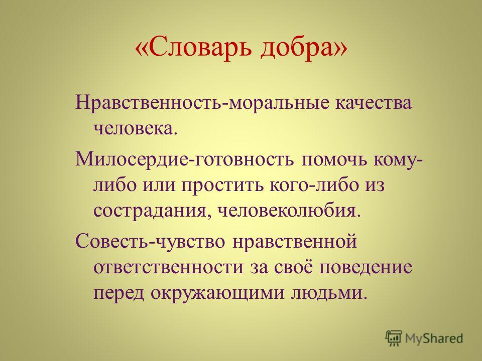 «Словарь добра» Нравственность-моральные качества человека. Милосердие-готовность помочь кому- либо или простить кого-либо из сострадания, человеколюбия. Совесть-чувство нравственной ответственности за своё поведение перед окружающими людьми.
