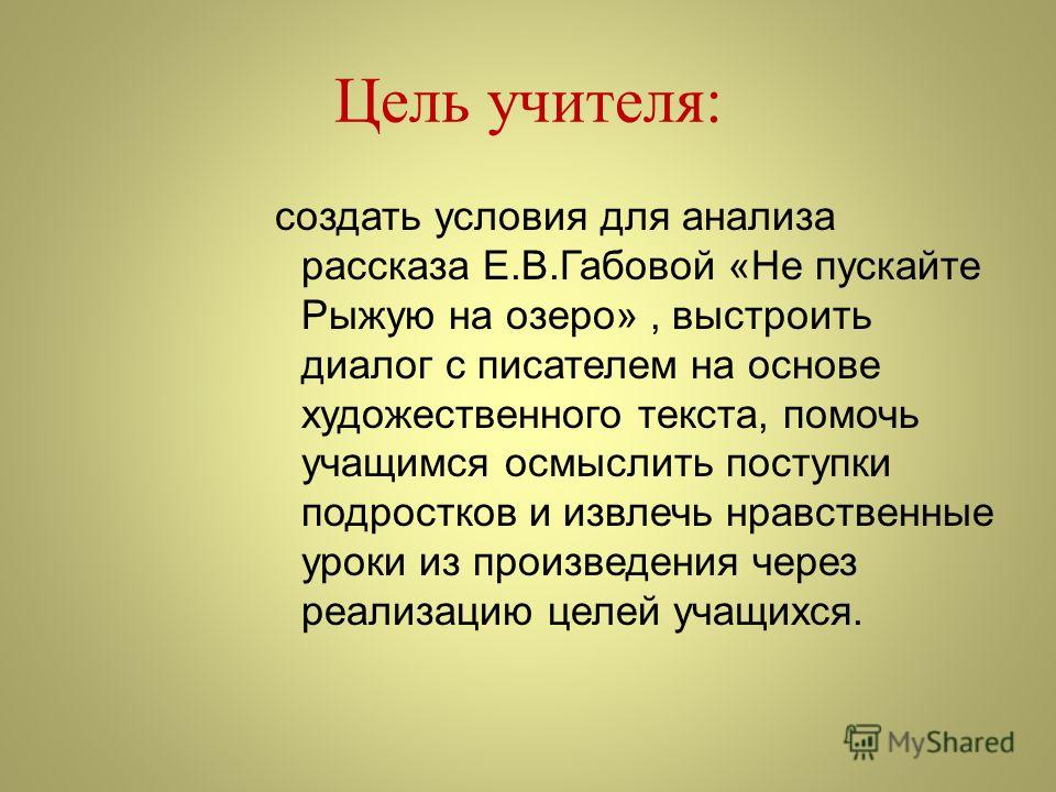 Цель учителя: создать условия для анализа рассказа Е.В.Габовой «Не пускайте Рыжую на озеро», выстроить диалог с писателем на основе художественного текста, помочь учащимся осмыслить поступки подростков и извлечь нравственные уроки из произведения через реализацию целей учащихся.