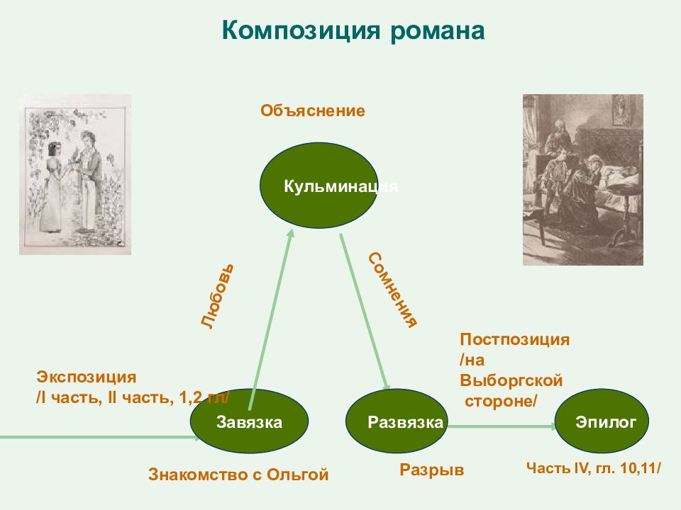 - Завязка, вторая часть, является точкой отсчета для деградации личности главного героя. Даже страсть к Ольге и преданная дружба с Штольцем не делают Илью Ильича лучше. Эта часть также представляет собой начало его знакомства с Ильинской, что впоследствии перерастет в кульминацию романа.