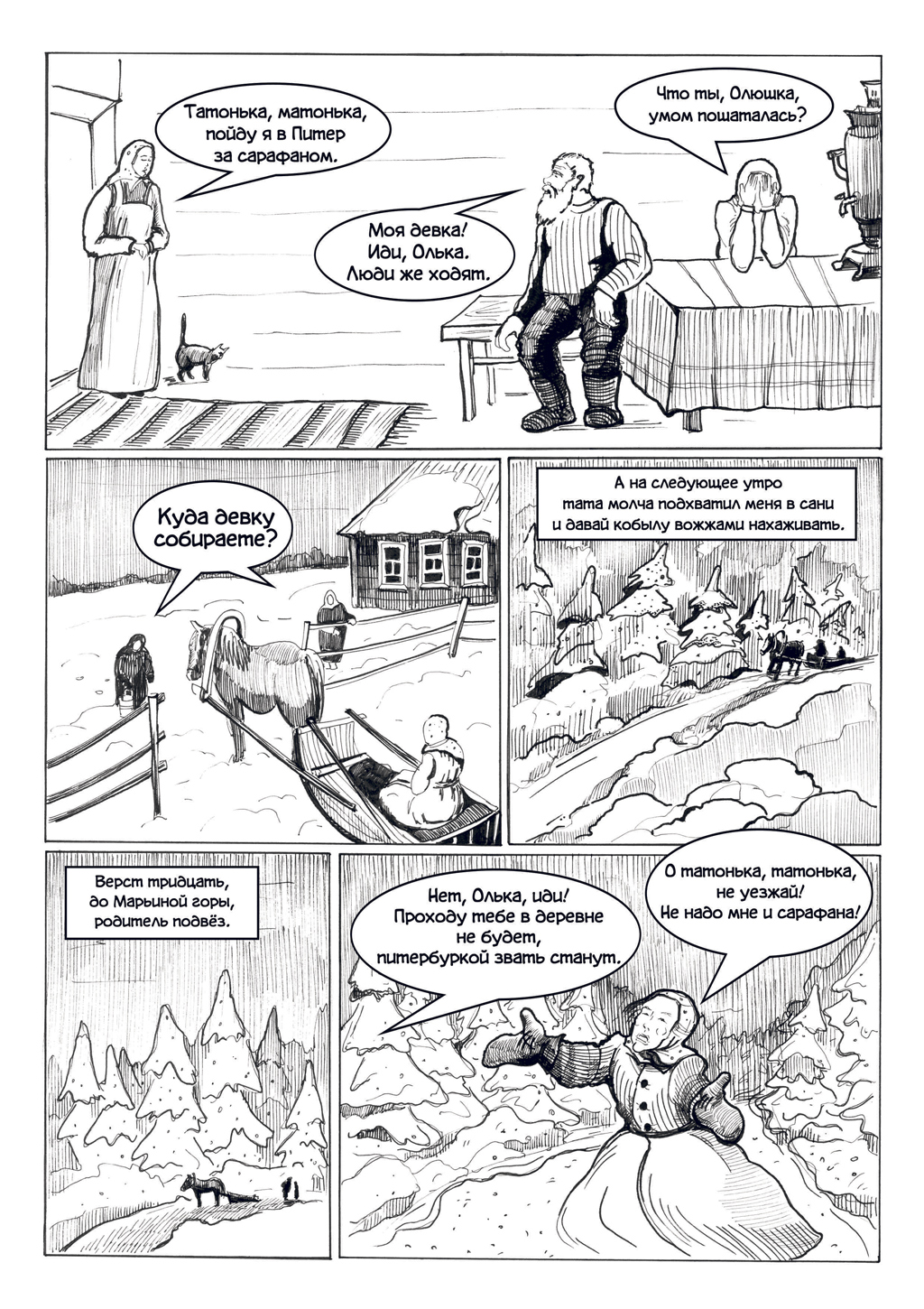 Интересен был поиск образа главной героини. Рассказывая историю своей жизни, героиня предстает перед нами и в юном, и в уже достаточно пожилом возрасте. Необходимо было нарисовать молоденькую девушку, а потом «состарить» ее. Я пошла от обратного: сначала нашла свой образ Филиппьевны, а потом представила ее в молодости. Пришлось пересмотреть много фотографий разных бабушек, чтобы понять, какая она будет на рисунках и как лучше ее нарисовать.