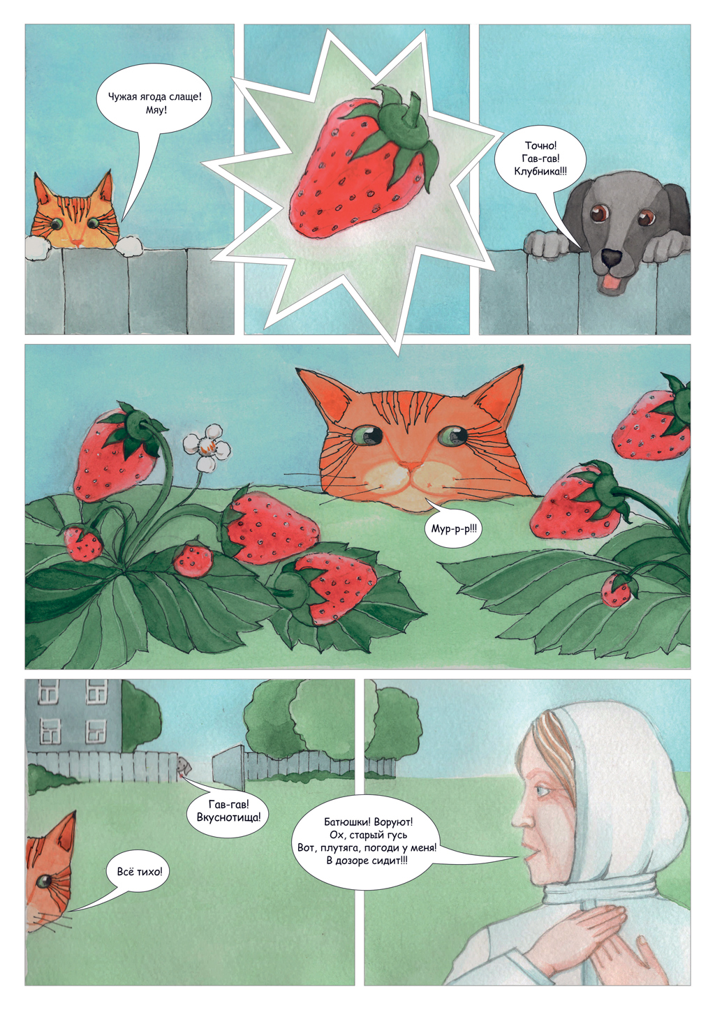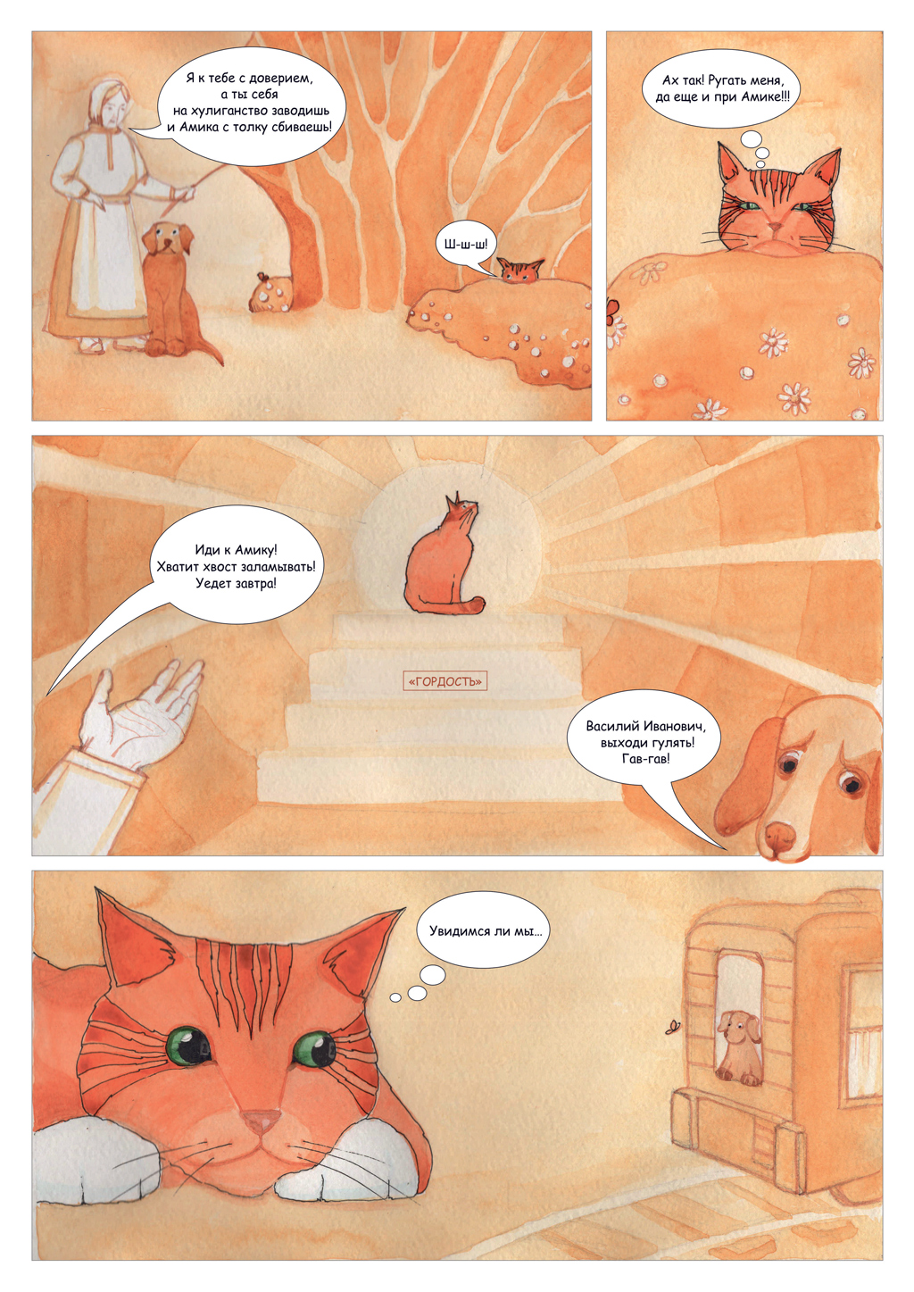 После проделанной работы могу сказать, что я полюбила жанр комикса, он стал для меня родным. Я убедилась, что комиксы — это не только мультяшные персонажи, легковесный сюжет и междометия, они могут быть глубокими, на серьезные темы. Я научилась выражать слова и эмоции через изображение и цвет, научилась краткости, меткости слова, рисунка. Проект дал мне стимул — хочется больше рисовать, пробовать новые материалы. Задолго до основной реализации проекта я начала рисовать отдельные сцены из рассказа акварелью, чтобы понять, как будут выглядеть кадры, это была большая предварительная работа, моя «кухня».
