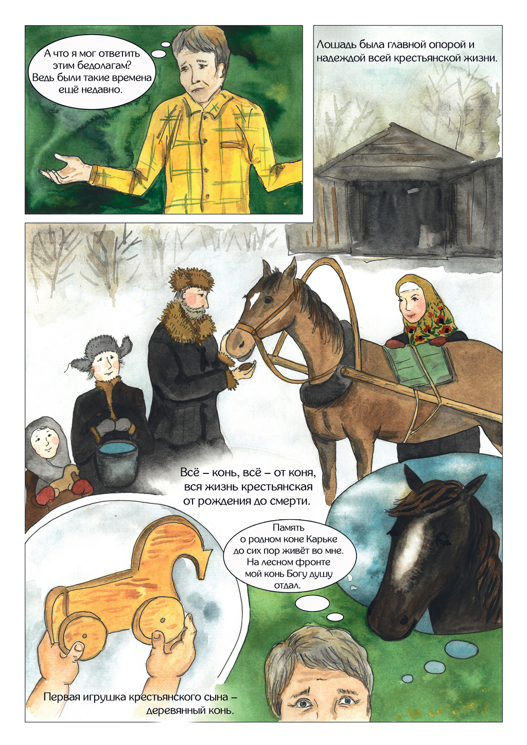 — Для меня открытием стал сам Федор Абрамов, его глубина, душевность и точное попадание слов в сердце. До проекта я, к сожалению, не была знакома с творчеством этого писателя. Теперь наверстываю упущенное. Самым сложным было, конечно же, не подвести команду, постараться донести идею проекта, а также очень бережно — посыл и содержание рассказа. Если брать техническую сторону, то сложностей лично у меня было много. Это и осваивание акварели, и рисование людей. Были дни, когда совсем не получалось ничего, да и сама тема рассказа постоянно комом в горле стояла. Про войну же… Интересно было поработать в команде, быть частью чего‑то большого, значимого, попробовать свои силы и возможности. И, конечно же, это дало свои плоды в виде большого опыта и роста в художественной части.