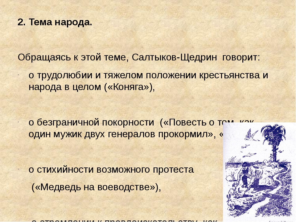 Это и тема деспотической власти («Медведь на воеводстве»), господ и рабов («Дикий помещик», «Повесть о том, как один мужи двух генералов прокормил»), тема страха как основы рабской психологии («Премудрый пескарь»), тема каторжного труда («Коняга») и другие. В сказках Салтыкова-Щедрина противостоят две социальные силы: народ и его эксплуататоры.