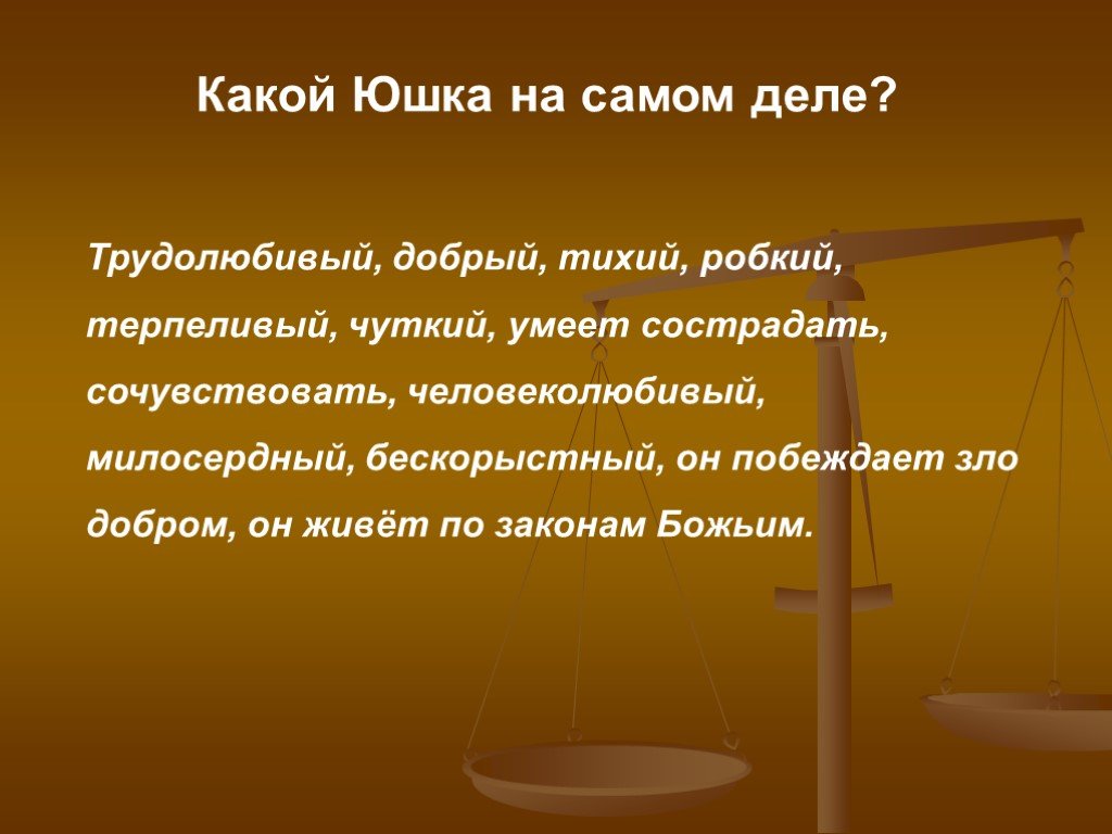 В первую очередь, он наставляет нас о важности бескорыстной любви к ближнему и об умении отвечать на насилие добротой. Жизнь Юшки служит ярким примером этих нравственных истин