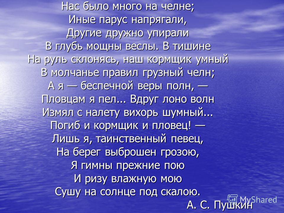 Нас было много на челне; Иные парус напрягали, Другие дружно упирали В глубь мощны веслы. В тишине На руль склонясь, наш кормщик умный В молчанье правил грузный челн; А я беспечной веры полн, А я беспечной веры полн, Пловцам я пел… Вдруг лоно волн Измял с налету вихорь шумный… Погиб и кормщик и пловец! Погиб и кормщик и пловец! Лишь я, таинственный певец, На берег выброшен грозою, Я гимны прежние пою И ризу влажную мою Сушу на солнце под скалою. А. С. Пушкин