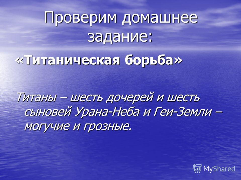 Проверим домашнее задание: «Титаническая борьба» Титаны – шесть дочерей и шесть сыновей Урана-Неба и Геи-Земли – могучие и грозные.