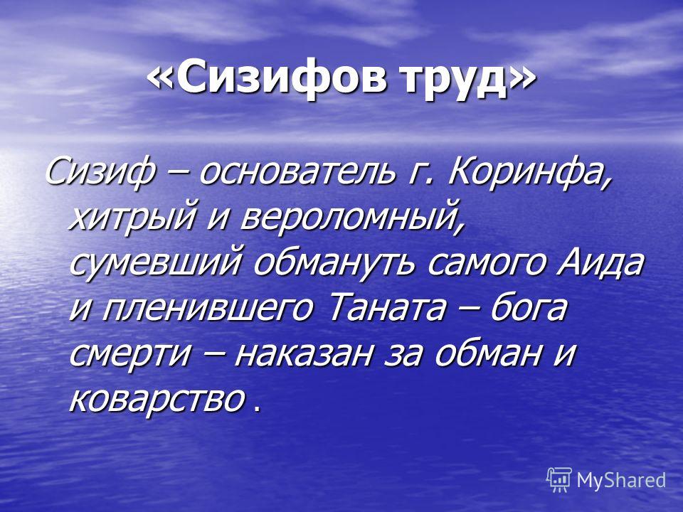 «Сизифов труд» Сизиф – основатель г. Коринфа, хитрый и вероломный, сумевший обмануть самого Аида и пленившего Таната – бога смерти – наказан за обман и коварство.