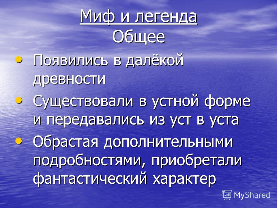 Миф и легенда Общее Появились в далёкой древности Появились в далёкой древности Существовали в устной форме и передавались из уст в уста Существовали в устной форме и передавались из уст в уста Обрастая дополнительными подробностями, приобретали фантастический характер Обрастая дополнительными подробностями, приобретали фантастический характер