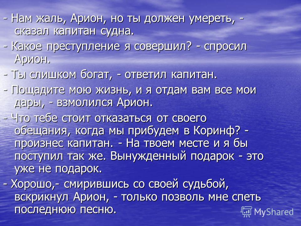 — Нам жаль, Арион, но ты должен умереть, — сказал капитан судна. — Какое преступление я совершил? — спросил Арион. — Ты слишком богат, — ответил капитан. — Пощадите мою жизнь, и я отдам вам все мои дары, — взмолился Арион. — Что тебе стоит отказаться от своего обещания, когда мы прибудем в Коринф? — произнес капитан. — На твоем месте и я бы поступил так же. Вынужденный подарок — это уже не подарок. — Хорошо,- смирившись со своей судьбой, вскрикнул Арион, — только позволь мне спеть последнюю песню.
