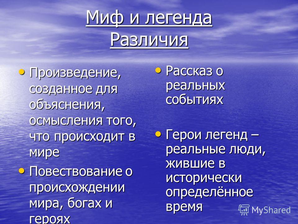 Миф и легенда Различия Произведение, созданное для объяснения, осмысления того, что происходит в мире Произведение, созданное для объяснения, осмысления того, что происходит в мире Повествование о происхождении мира, богах и героях Повествование о происхождении мира, богах и героях Рассказ о реальных событиях Рассказ о реальных событиях Герои легенд – реальные люди, жившие в исторически определённое время Герои легенд – реальные люди, жившие в исторически определённое время