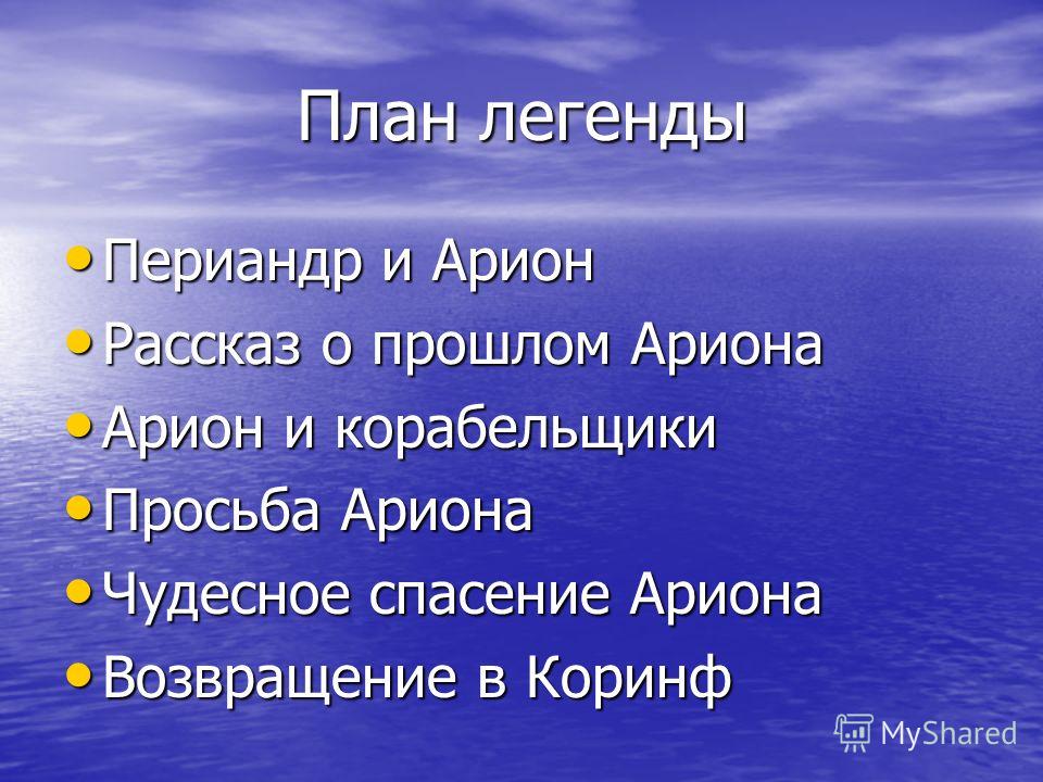 План легенды Периандр и Арион Периандр и Арион Рассказ о прошлом Ариона Рассказ о прошлом Ариона Арион и корабельщики Арион и корабельщики Просьба Ариона Просьба Ариона Чудесное спасение Ариона Чудесное спасение Ариона Возвращение в Коринф Возвращение в Коринф