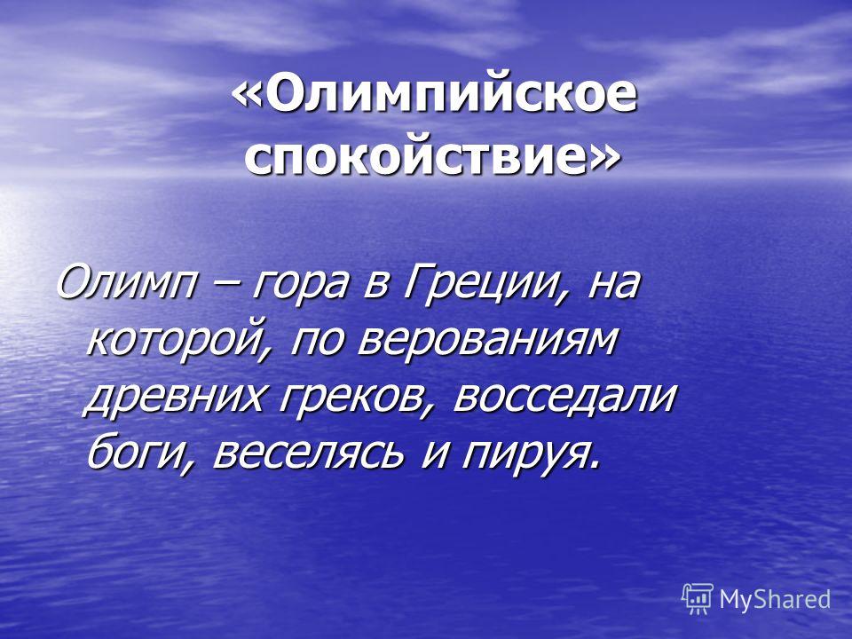 «Олимпийское спокойствие» Олимп – гора в Греции, на которой, по верованиям древних греков, восседали боги, веселясь и пируя.