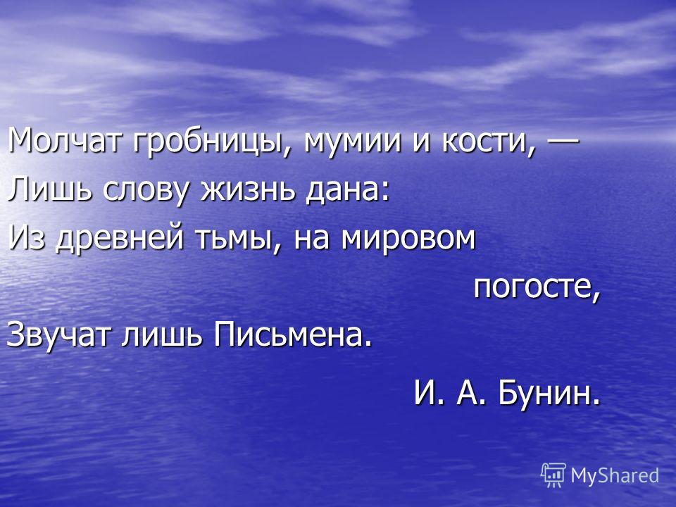 Молчат гробницы, мумии и кости, Молчат гробницы, мумии и кости, Лишь слову жизнь дана: Из древней тьмы, на мировом погосте, Звучат лишь Письмена. И. А. Бунин.