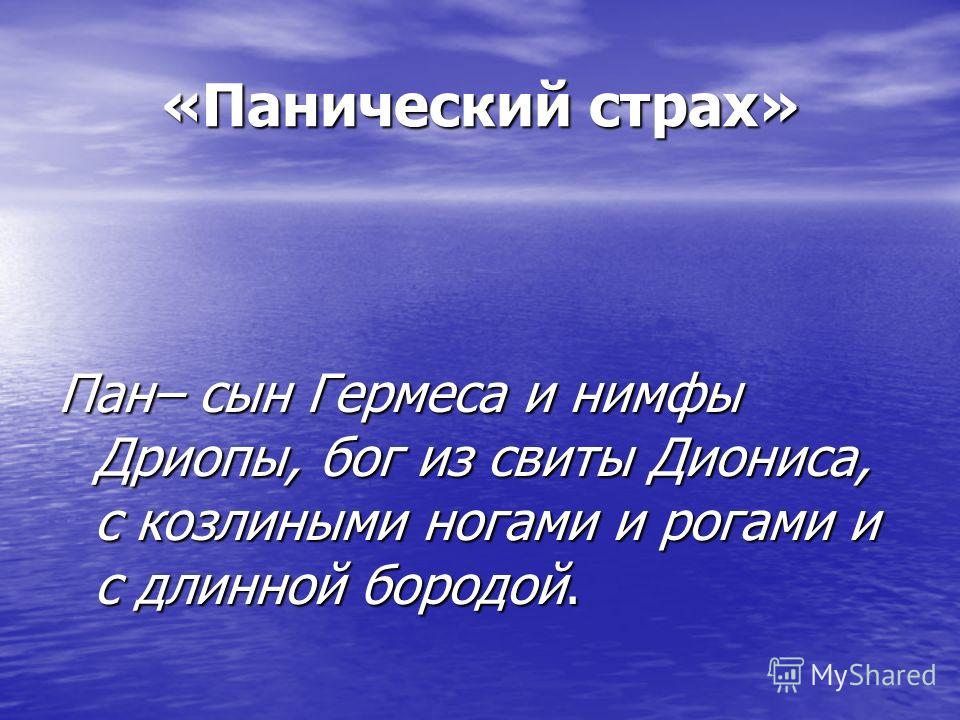 «Панический страх» Пан– сын Гермеса и нимфы Дриопы, бог из свиты Диониса, с козлиными ногами и рогами и с длинной бородой.