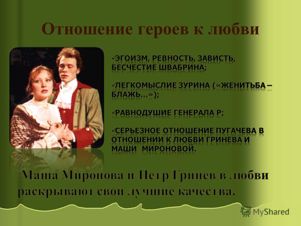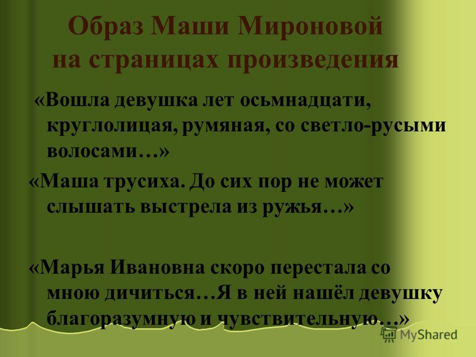 Примером следованию долгу и принципам офицерской чести является отец Маши – Иван Кузьмич. В отличие от Швабрина, он не потомственный дворянин, комендантом крепости стал, выслужившись из нижних чинов. Однако он не идет на сделку с совестью и отказывается служить Пугачеву, прекрасно понимая, что за это придется заплатить жизнью. Миронов противопоставляется Швабрину тем, что его представления о чести и долге базируются на личных качествах. Он действительно честный и добрый человек, для которого предательство является чем-то омерзительным.