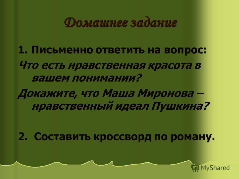 Домашнее задание 1. Письменно ответить на вопрос: Что есть нравственная красота в вашем понимании? Докажите, что Маша Миронова – нравственный идеал Пушкина? 2. Составить кроссворд по роману.