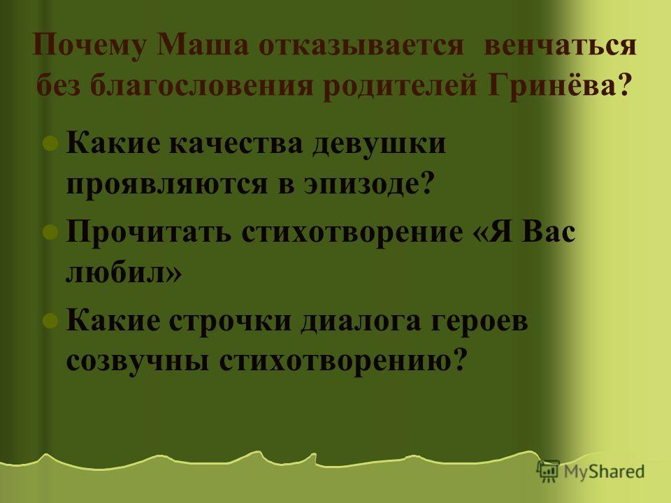 Гринёв сильный и смелый, упрямый, остаётся при своих намерениях, несмотря ни на что. Человек чести и совести: «Только не требуй того, что противно чести моей и христианской совести…». Гордый, отказывается целовать руку Пугачёву и присягать ему.