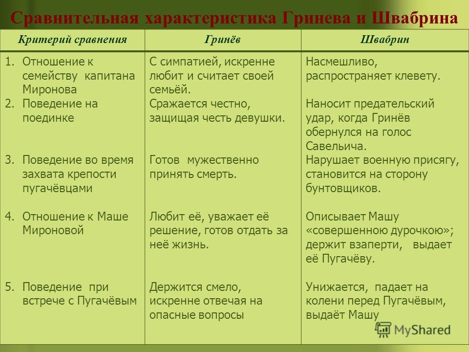 Противопоставлен Петру Гриневу Швабрин. Швабрин — типичный пример человека лживого, завистливого и способного на разные низости и гадости. Швабрин далек от русского народа, он не понимает бунт Пугачева, также герой считает себя лучше всех, поэтому его поведение распущенно и вызывающе. Понятия чести у Швабрина нет. Это можно понять из ситуации с Машей Мироновой. Швабрин оскорбляет и унижает невинную девушку, преследуя свои личные интересы. Петр Гринев же, наоборот, смог защитить честь молодой девушки, в которую он действительно влюблен.