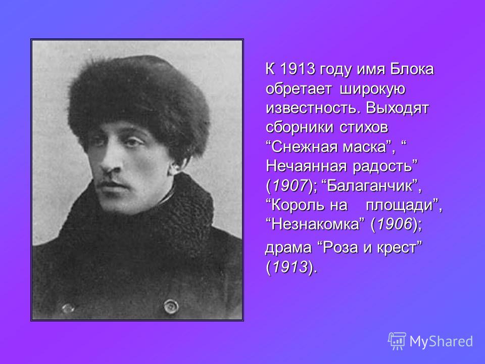 К 1913 году имя Блока обретает широкую известность. Выходят сборники стихов Снежная маска, Нечаянная радость (1907); Балаганчик, Король на площади, Незнакомка (1906); драма Роза и крест (1913). драма Роза и крест (1913).