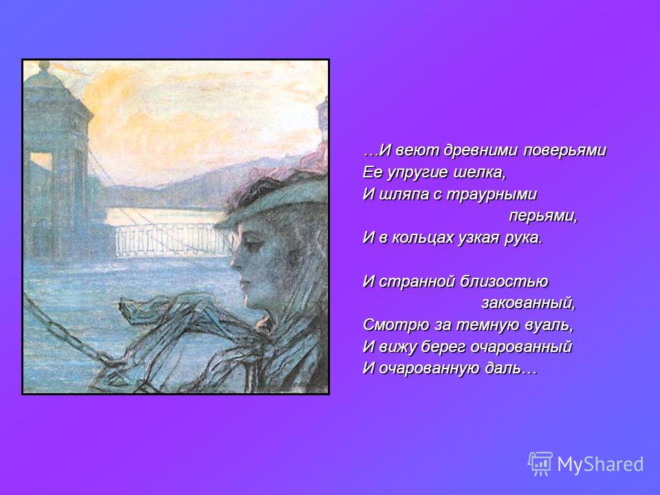 …И веют древними поверьями Ее упругие шелка, И шляпа с траурными перьями, перьями, И в кольцах узкая рука. И странной близостью закованный, закованный, Смотрю за темную вуаль, И вижу берег очарованный И очарованную даль…