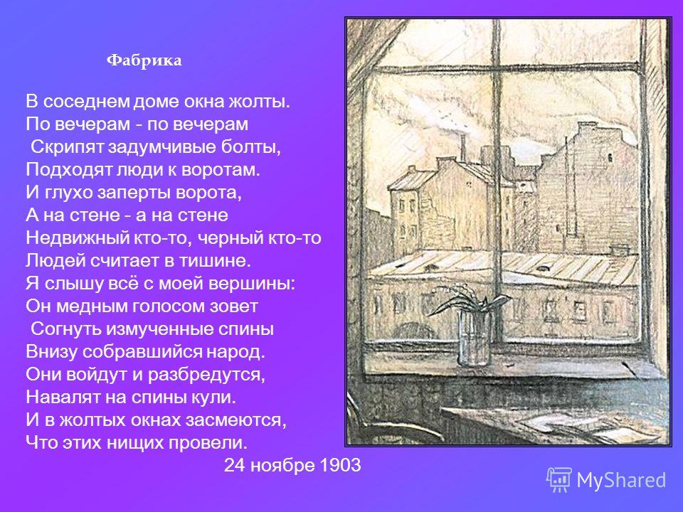 Фабрика В соседнем доме окна жолты. По вечерам — по вечерам Скрипят задумчивые болты, Подходят люди к воротам. И глухо заперты ворота, А на стене — а на стене Недвижный кто-то, черный кто-то Людей считает в тишине. Я слышу всё с моей вершины: Он медным голосом зовет Согнуть измученные спины Внизу собравшийся народ. Они войдут и разбредутся, Навалят на спины кули. И в жолтых окнах засмеются, Что этих нищих провели. 24 ноябре 1903