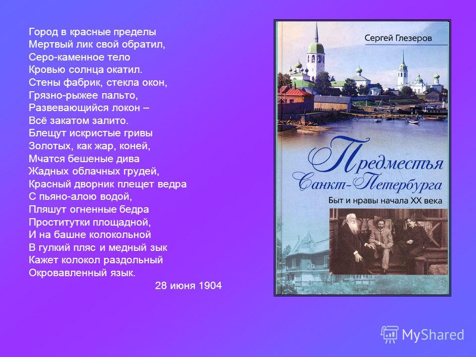 Город в красные пределы Мертвый лик свой обратил, Серо-каменное тело Кровью солнца окатил. Стены фабрик, стекла окон, Грязно-рыжее пальто, Развевающийся локон – Всё закатом залито. Блещут искристые гривы Золотых, как жар, коней, Мчатся бешеные дива Жадных облачных грудей, Красный дворник плещет ведра С пьяно-алою водой, Пляшут огненные бедра Проститутки площадной, И на башне колокольной В гулкий пляс и медный зык Кажет колокол раздольный Окровавленный язык. 28 июня 1904