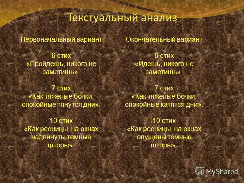 Текстуальный анализ Первоначальный вариант 6 стих «Пройдешь, никого не заметишь». 7 стих «Как тяжелые бочки, спокойные тянутся дни». 10 стих «Как ресницы, на окнах надвинуты темные шторы». Окончательный вариант 6 стих «Идешь, никого не заметишь». 7 стих «Как тяжелые бочки, спокойные катятся дни». 10 стих «Как ресницы, на окнах опущены темные шторы».