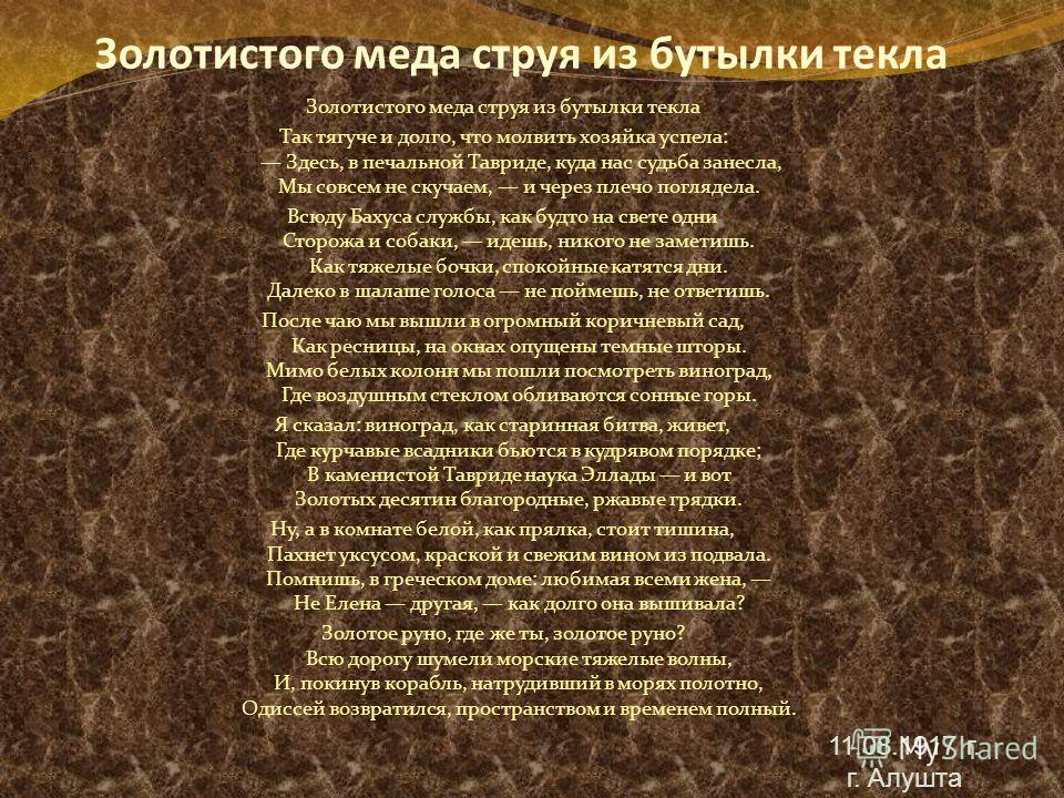 Золотистого меда струя из бутылки текла Так тягуче и долго, что молвить хозяйка успела: Здесь, в печальной Тавриде, куда нас судьба занесла, Мы совсем не скучаем, и через плечо поглядела. Всюду Бахуса службы, как будто на свете одни Сторожа и собаки, идешь, никого не заметишь. Как тяжелые бочки, спокойные катятся дни. Далеко в шалаше голоса не поймешь, не ответишь. После чаю мы вышли в огромный коричневый сад, Как ресницы, на окнах опущены темные шторы. Мимо белых колонн мы пошли посмотреть виноград, Где воздушным стеклом обливаются сонные горы. Я сказал: виноград, как старинная битва, живет, Где курчавые всадники бьются в кудрявом порядке; В каменистой Тавриде наука Эллады и вот Золотых десятин благородные, ржавые грядки. Ну, а в комнате белой, как прялка, стоит тишина, Пахнет уксусом, краской и свежим вином из подвала. Помнишь, в греческом доме: любимая всеми жена, Не Елена другая, как долго она вышивала? Золотое руно, где же ты, золотое руно? Всю дорогу шумели морские тяжелые волны, И, покинув корабль, натрудивший в морях полотно, Одиссей возвратился, пространством и временем полный г. г. Алушта
