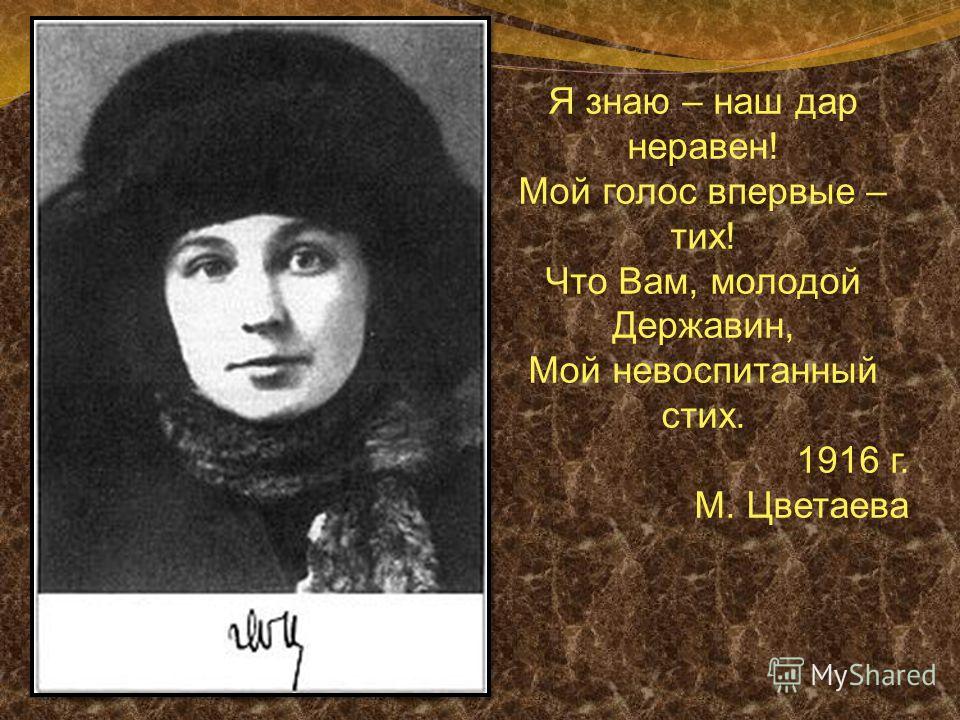 Я знаю – наш дар неравен! Мой голос впервые – тих! Что Вам, молодой Державин, Мой невоспитанный стих г. М. Цветаева