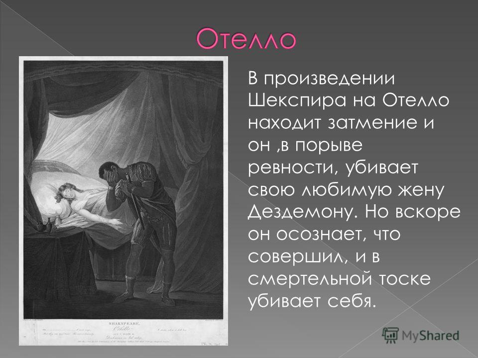 Отелло Это видно на примере зарождающейся ненависти и мести Яго, ревнивой ярости Отелло и трагического конца Дездемоны, основанного на непонимании, недоверии и манипуляции.